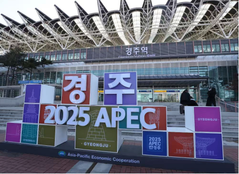 当地时间10月27日,人们在庆州火车站内APEC主题打卡点拍照留念。亚太经合组织(APEC)第三十二次领导人非正式会议将于10月31日至11月1日在韩国庆州举行。