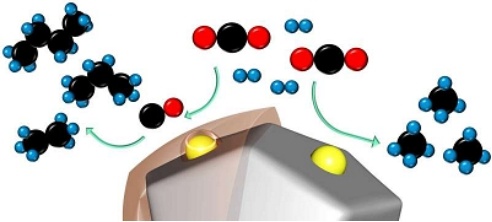 CO2(黑色和红色)和氢分子(蓝色)在钌基催化剂的帮助下发生反应。在右边,未涂层的催化剂产生最简单的碳氢化合物甲烷。在左侧,涂层催化剂产生更长链的碳氢化合物,如丁烷、丙烷和乙烷。图片来源:陈荣治